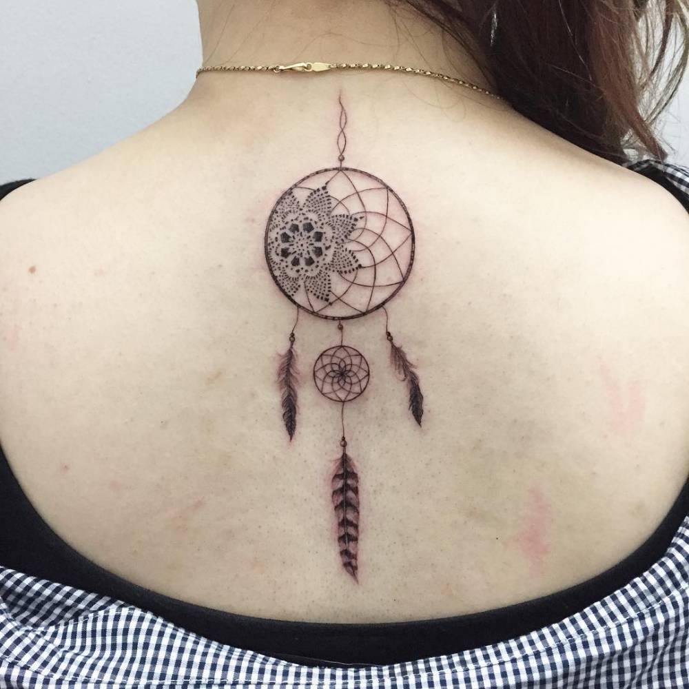 Очень изысканно смотрится популярное среди женщин тату Ловец Снов, которое очень часто размещают на спине. Кроме того, в этом стиле рисуют и разные цветочные орнаменты