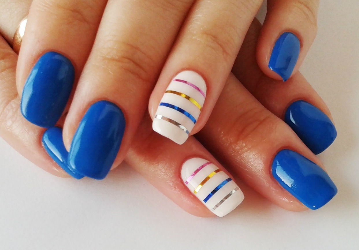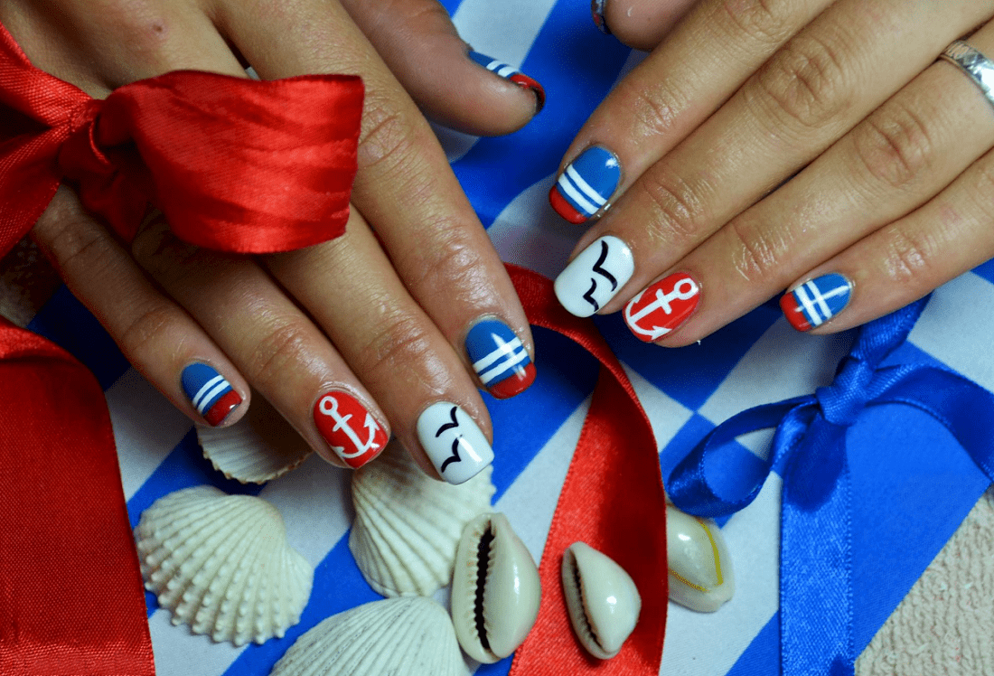 . Нужно лишь одеться в подходящем виде, сделать прическу, макияж и маникюр с дизайном ногтей в морском стиле. Сейчас модно использовать различные рисунки на каждый ноготь. Соответственно, дизайн ногтей в таком стиле подразумевает указанные выше базовые цвета и их разновидности, а также полоску (широкую, узкую, сплошную или частичную). Помимо полоски можно использовать соответствующие цвета в однотонном виде.